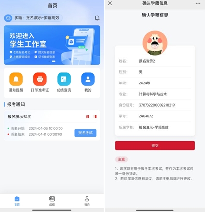 1、考生初次登錄報(bào)名系統(tǒng)時(shí),系統(tǒng)將自動顯示考生的個(gè)人信息,考生應(yīng)反復(fù)核對姓名、身份證號碼等信息,確認(rèn)無誤后方可報(bào)名,否則將導(dǎo)致成績合格的考生成績無法被所在高校導(dǎo)出認(rèn)定。因考生本人錯報(bào)、漏報(bào)造成無法參加考試或者考試成績無效,由考生本人負(fù)責(zé)。